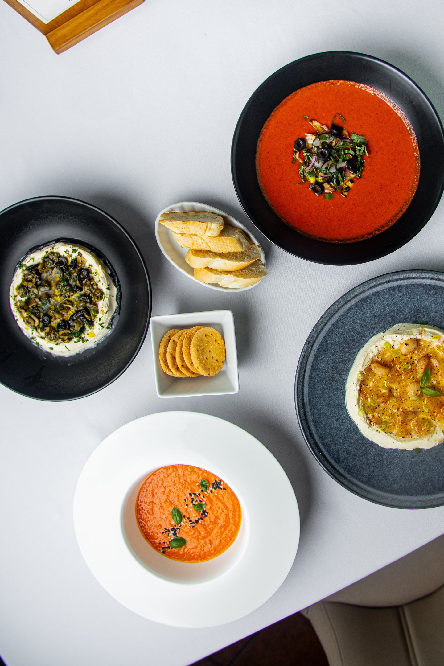 Base de puré de garbanzos, chile morrón asado, almendras y albahaca